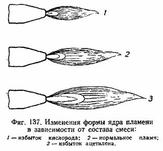 На фиг. 137 схематически показаны изменения очертания ядра пламени при изменениях состава газовой смеси. Изменения размеров, формы и цвета ядра хорошо заметны и могут служить чувствительным индикатором для определения состава газовой смеси. При некотором навыке по виду ядра пламени можно достаточно точно устанавливать нормальный состав газовой смеси, не пользуясь никакими измерительными приборами для расхода газов.