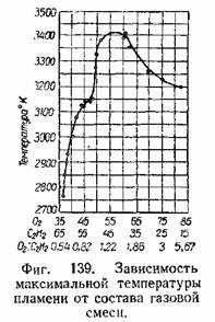 На фиг. 138 показано изменение температуры по оси нормального пламени, а на фиг. 139 показана зависимость максимальной температуры пламени от состава газовой смеси. Максимальная температура сосредоточена на небольшом участке пламени, который в процессе сварки должен находиться у поверхности металла. Из фиг. 139 видно, что наивысшая температура пламени, а следовательно, и производительность сварки наблюдается при некотором избытке кислорода в смеси по сравнению с нормальным пламенем. Максимальную температуру нормального пламени для достаточно чистых кислорода и ацетилена можно принять равной 3100—3200°.