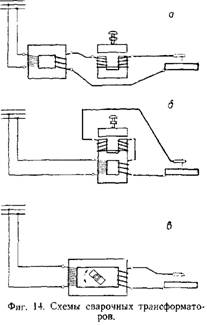 с увеличенной индуктивностью без дроссельной катушки. Все эти три вида трансформаторов, принципиальные схемы которых изображены на фиг. J4, находят практическое применение в нашей промышленности. Видоизменения основных схем и объединение элементов отдельных схем образуют громадное количество возможных систем и конструкций сварочных трансформаторов.