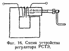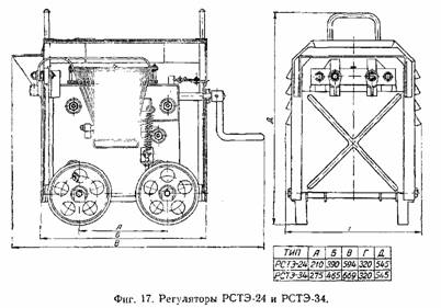 На фиг. 15 показаны такие трансформаторы изготовления завода Электрик. Комплектный сварочный аппарат состоит из трансформатора СТЭ и дроссельной катушки или регулятора РСТЭ, включаемого во вторичную цепь последовательно с дугой. Магнитопровод дроссельной катушки сделан разъёмным. Устройство регулятора схематически показано на фиг. 16, а конструктивное выполнение с габаритными размерами — на фиг. 17.