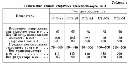 Трансформаторы СТЭ выпускаются нескольких типов, отличающихся лишь мощностью. Основные технические данные этих трансформаторов приведены в табл. 1. Небольшие вес и габаритные размеры делают сварочные трансформаторы весьма портативными. Для удобства перемещения трансформатор и дроссель поставлены на ролики и снабжены ручками.