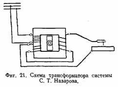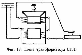 Примером сварочных трансформаторов, конструктивно объединённых в одно целое с дроссельной катушкой, могут служить трансформаторы СТН, предложенные академиком В. П. Никитиным ещё в 1925 г. и получившие широкое распространение после войны, когда в них был внесён ряд конструктивных изменений и улучшений. Первоначальная схема трансформатора СТН показана на фиг. 18.