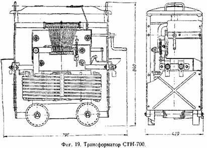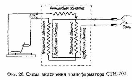 На фиг. 19 показан трансформатор типа СТН-700 в современном исполнении завода Электрик, а на фиг. 20 приведена его электрическая схема. Трансформатор имеет вторичное напряжение холостого хода 60 в. Сварочный ток может регулироваться в пределах от 200 до 900 а. Максимально допустимый сварочный ток 540 а при ПВ 100% и 700 а для ПВ 60%. Вес трансформатора 380 кг. Регулирование сварочного тока производится перемещением подвижного сердечника в дроссельной обмотке посредством рукоятки, аналогично трансформаторам СТЭ.
