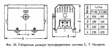 Схема устройства трансформатора показана на фиг. 21. Трансформатор изготовляется двух типов, габаритные размеры которых даны на фиг. 22. Меньший тип СТ-150 или Комсомолец имеет максимально допустимый сварочный ток 150 а при ПВ 60%, больший тип СТ-480—480 а при ПВ 60%. Трансформаторы изготовляются заводами промкооперации. В дальнейшем эти трансформаторы при участии автора их были конструктивно доработаны и усовершенствованы секцией электросварки Академии наук СССР под руководством акад. В. П. Никитина и выпускаются заводами промышленности, как тип СТАН.