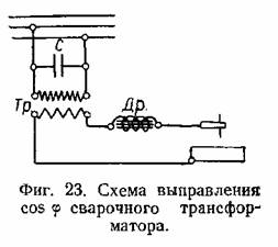 , для чего удобнее всего параллельно к зажимам первичной обмотки каждого отдельного сварочного трансформатора присоединять конденсатор (фиг. 23). Для каждого трансформатора при ручной сварке обычно достаточен конденсатор ёмкостью около 100 мкф , который может быть встроен в кожух трансформатора.