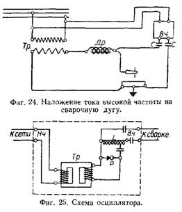 Индуктивное сопротивление прямо пропорционально, а ёмкостное обратно пропорционально частоте тока. Поэтому можно осуществить одновременное параллельное питание дуги сварочным током низкой частоты, подаваемым от сварочного трансформатора Тр через индуктивное сопротивление — дроссельную катушку Др , и вспомогательным током зажигания, подаваемым от генератора высокой частоты ВЧ через фильтрующие конденсаторы С, как это показано на принципиальной схеме (фиг. 24). Источником вспомогательного тока в схемах, подобных схеме на фиг. 24, служат обычно небольшие искровые генераторы, получившие в сварочной технике название осцилляторов.