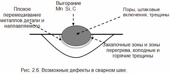 - малый объем и кратковременность существования ванны, поэтому плохо перемешивается металл, возможны поры (не успевают выделиться газы) и шлаковые включения в сварном шве;