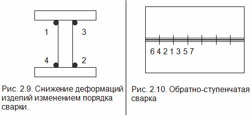 Значительное уменьшение деформации достигается способом обратноступенчатой сварки. При этом способе кромки деталей, подлежащие сварке, делят на части, которые сваривают в последовательности, показанной на рисунке 2.10. Коробление изделия в данном случае получается значительно меньше, т.к. деформации коротких швов не в состоянии вызывать значительную деформацию всего изделия.