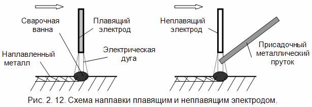 Для возбуждения дуги используются чаще всего плавящие металлические и реже неплавящие (угольные и вольфрамовые) электроды (рис. 2.12). В первом случае сварной шов образуется за счет расплавления электрода, а во втором случае в дугу вводится присадочный металлический пруток, который плавится и заполняет сварной шов.