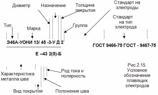 Электроды поставляются потребителям в упаковке, на которой наносится условное обозначение (рис. 2.15), включающее основные технологические сведения об электродах. Первые в мире сварочные электроды начали изготовлять в 1890 году на Пермских пушечных заводах, начальником которых был изобретатель плавящих электродов Славянов Н. Г. Высокого качества электроды (приложение 2.1.) в настоящее время изготовляются на Тюменском заводе сварочных электродов.