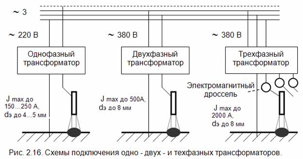 в двух и трехфазных трансформаторах понижается до более низкого напряжения (40…90В холостого хода). Во вторичной обмотке в несколько раз меньше витков, чем у первичной обмотки, а провод изготовляется значительно большего сечения, т.к. сварочные токи измеряются сотнями и тысячами ампер. Сила сварочного тока регулируется несколькими способами: переключением вторичных обмоток (изменение числа витков), изменением воздушного зазора между подвижным пакетом и неподвижным магнитопроводом, перемещением катушек вторичной обмотки и включением магнитного дросселя в сварочную цепь.