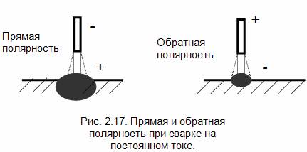Сварка может выполнятся как на переменном, так и на постоянном токе. По возможности следует проводить сварку на переменном токе, т.к. она раза в два экономичнее сварки на постоянном токе. Следует иметь ввиду, что температура дуги выше на аноде, чем на катоде. Поэтому при необходимости глубокого проплавления металла применяют прямую полярность: плюс (анод) на деталь, а минус (катод) на электрод (рис. 2.17.). Для уменьшения перегрева детали применяют обратную полярность: минус присоединяют к деталям, а плюс на электрод.