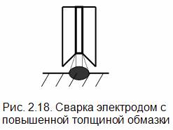 Сварка с глубоким проплавлением (рис 2.18). Используется электрод ОЗС с повышенной толщиной покрытия, у которого расплавление обмазки несколько отстает от расплавления электрода, поэтому дуга плавится как бы внутри чехла. Действие дуги концентрируется и меньше потерь тепла, поэтому глубина проплавления увеличивается.