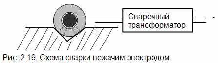 Сварка лежачим электродом (рис. 2.19). Электрод с повышенной толщиной обмазки укладывается в разделку шва, возбуждают дугу, которая горит и по мере расплавления электрода перемещается по его длине.