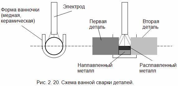 4. Сварка ванным способом (рис. 2.20). В месте соединения арматурных и других стержней делают ванночку из стальной или медной ленты, либо используют керамическую разъемную форму. Между стыками стержней оставляют зазор около 1,5 диаметра электрода с покрытием; при горении дуги в этом пространстве образуется ванна жидкого металла. Для того, чтобы ванна не успевала остыть, берут толстые электроды или пучок электродов, используют повышенный ток и без задержек меняют электроды.