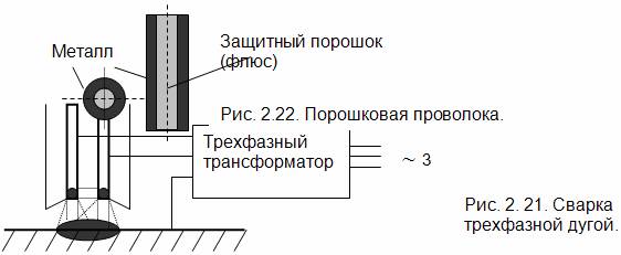 5. Сварка трехфазной дугой (рис. 2.21). Используется специальный электрод, состоящий из двух электрически изолированных между собой стержней и покрытых общей обмазкой. К каждому стержню подводится по фазе, а третья — к детали.