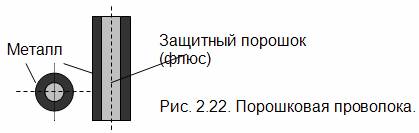 6. Сварка порошковой проволокой (рис. 2.22). Наружная оболочка является проводником электрического тока, защитным устройством для сердечника.