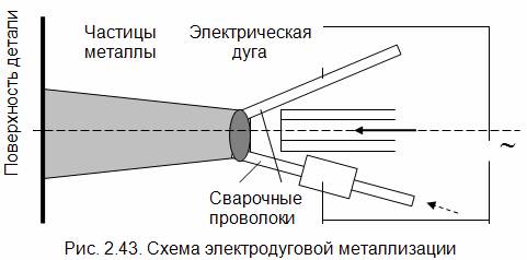 При электродуговой металлизации (рис. 2.43.) две изолированные проволоки подаются с одинаковой скоростью, между ними возбуждается электрическая дуга, металл плавится, газ распыляет металл и подает частицы металла к детали.
