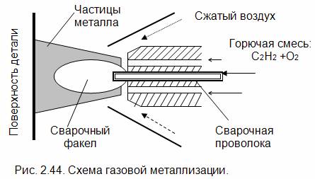 При газовой металлизации (рис. 2.44) чаще всего используется ацетилено-кислородное пламя, которое расплавляет сварочную проволоку, а сжатый воздух или инертный газ распыляет и наносит частицы на поверхность. При газовой металлизации получается мелкий распыл, но оборудование относительно сложнее, чем при электродуговой металлизации.
