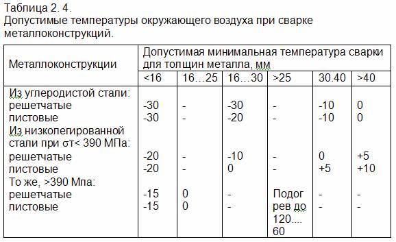 Сварка при низких температурах. В зависимости от марки стали и толщины металла и вида металлоконструкции (табл. 2.4) устанавливается минимально допустимая температура сварки без нагрева. Углеродистые стали допускают более низкую температуру сварки, чем низколегированные. Чем тоньше металл, тем может быть допустима более низкая температура сварки.