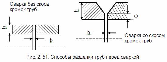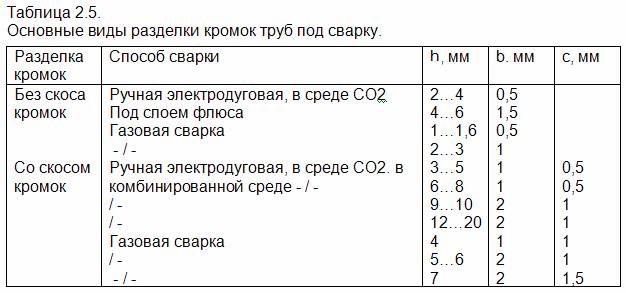 Перед сваркой разделывают концы труб (рис. 2. 51) в зависимости от толщины ее стенок и вида сварки (табл.2.5).