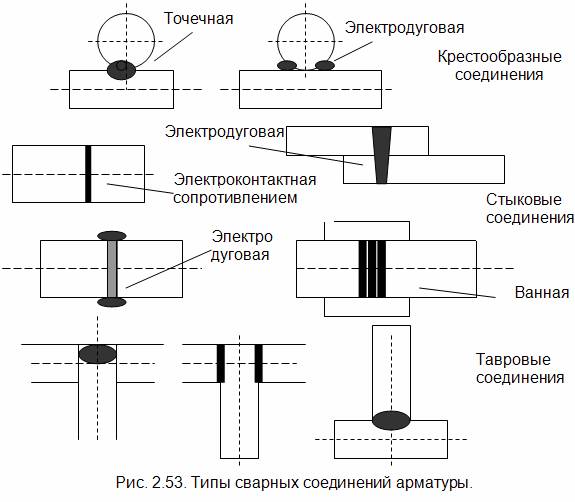 Электрод выбирается исходя из класса арматурной стали (А-I, А -II... A т -V), способов сварки (ванная или многослойные швы, протяжные швы, в штампованном отверстии, прихватами) и типов соединения (крестообразное, стыковое, нахлесточное, тавровое).