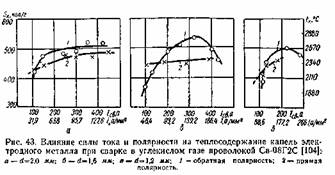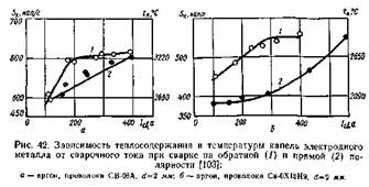 При сварке проволоками малого диаметра (1,2 и 1,6 мм) при обратной полярности наблюдается максимум теплосодержания капель в определенных пределах токов и снижение его с дальнейшим ростом тока.