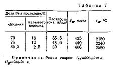 Температура капель при сварке порошковой проволокой зависит от соотношения масс железа оболочки и сердечника. Поскольку сердечник порошковой проволоки практически не электропроводен, нагрев и плавление его происходят, в основном, за счет излучения дуги. Чем большая доля холодного железа сердечника поступает в каплю, тем ниже ее температура (табл. 7).